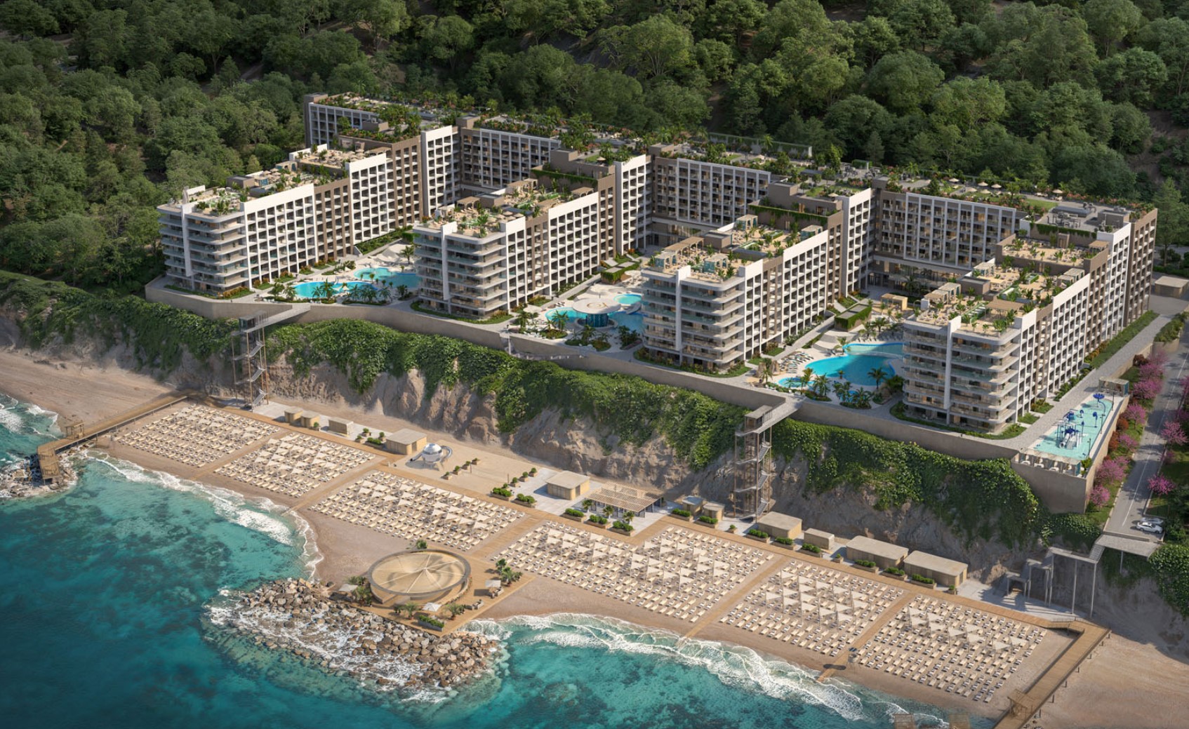 Проект представляет собой апарт-отель бизнес-класса, состоящий из 13 корпусов. Комплекс возведен с использованием современных технологий и отличается элементами южной курортной архитектуры. В комплексе представлены апартаменты в различных планировках площадью от 36 до 83 кв. метров. Апартаменты сдаются без отделки, с потолками высотой 2,8 метров и застекленными балконами.